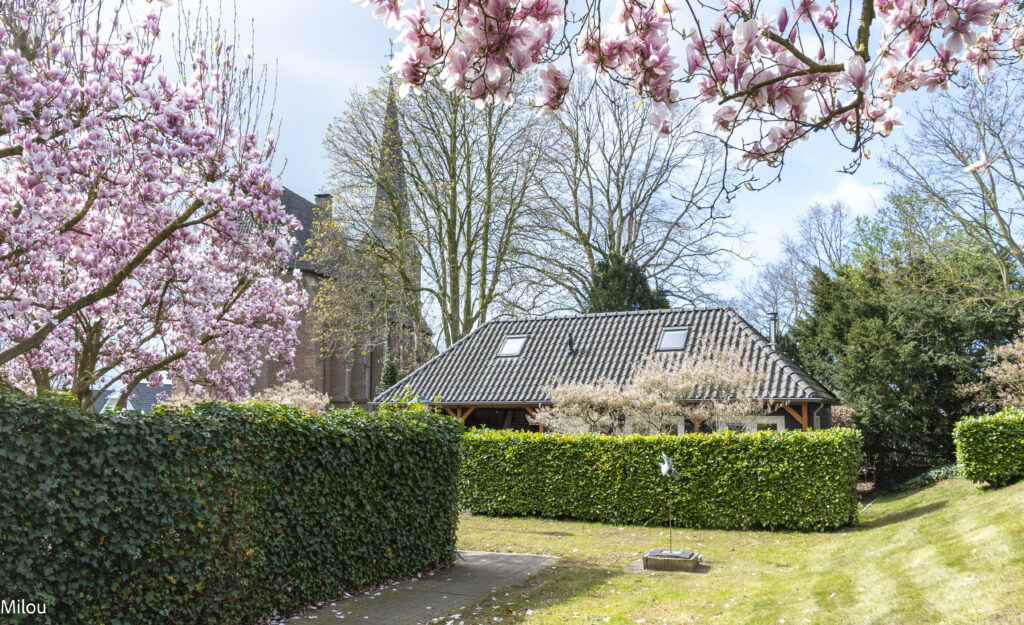 Op dit moment staan de grote magnolia’s in bloei en ook bij de krentenbomen komt de witte bloesem uit.